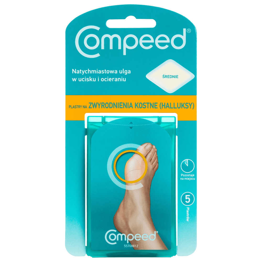 Plastry Compeed® na zwyrodnienia kostne (halluksy) zapewniają ulgę od bolesnego ucisku i tarcia. Pomagają zapobiegać powstawaniu pęcherzy i dalszemu twardnieniu skóry, co może prowadzić do innych bolesnych schorzeń skóry.