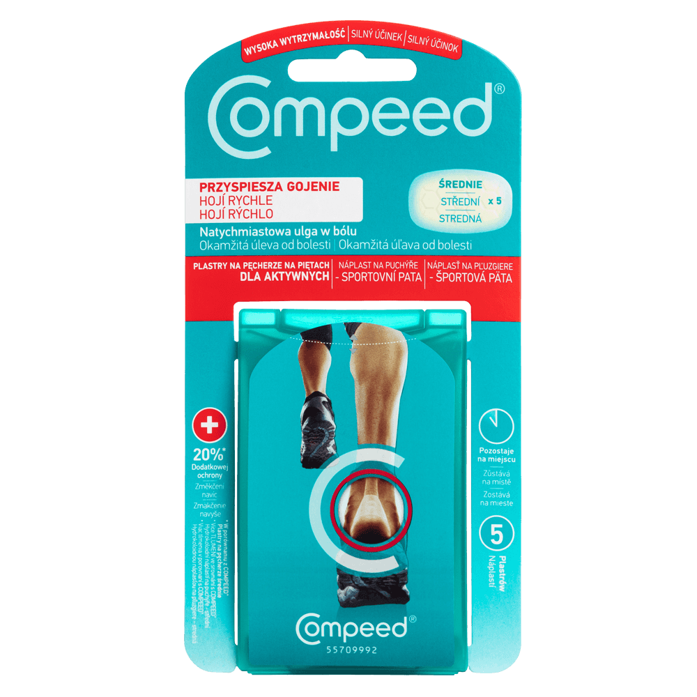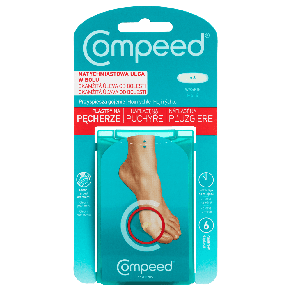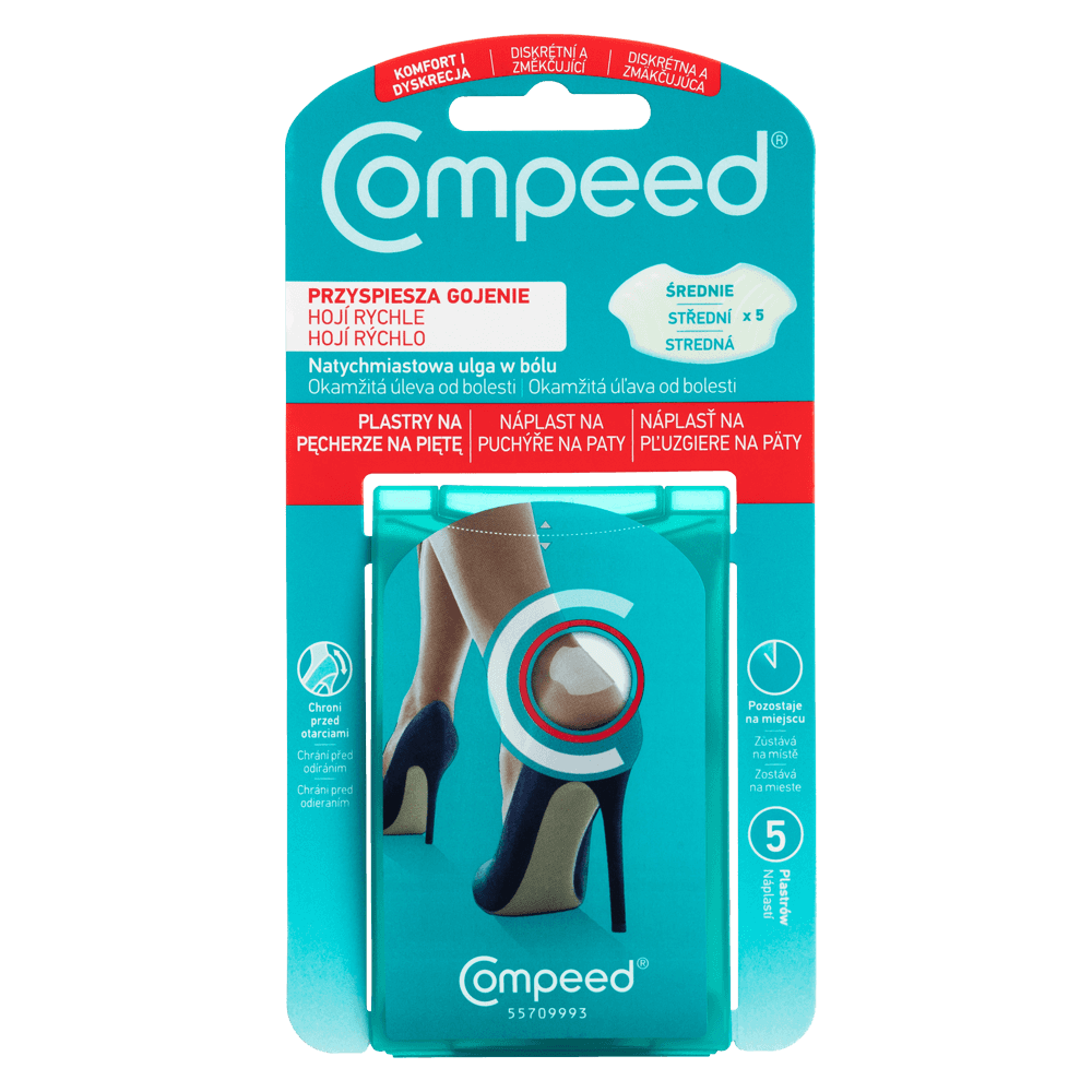 Plastry Compeed na pęcherze zostały opracowane specjalnie po to, aby zapewnić natychmiastową ulgę w bólu dzięki ochronnej poduszce, a technologia hydrokoloidowa zapewnia optymalne warunki gojenia się pęcherzy na stopach.Ultraprzylepne, wymodelowane krawędzie sprawiają, że plaster Compeed elastycznie dopasowuje się do ruchów i pozostaje na miejscu do 7 dni. W indywidualnych przypadkach czas ten może się różnić.
